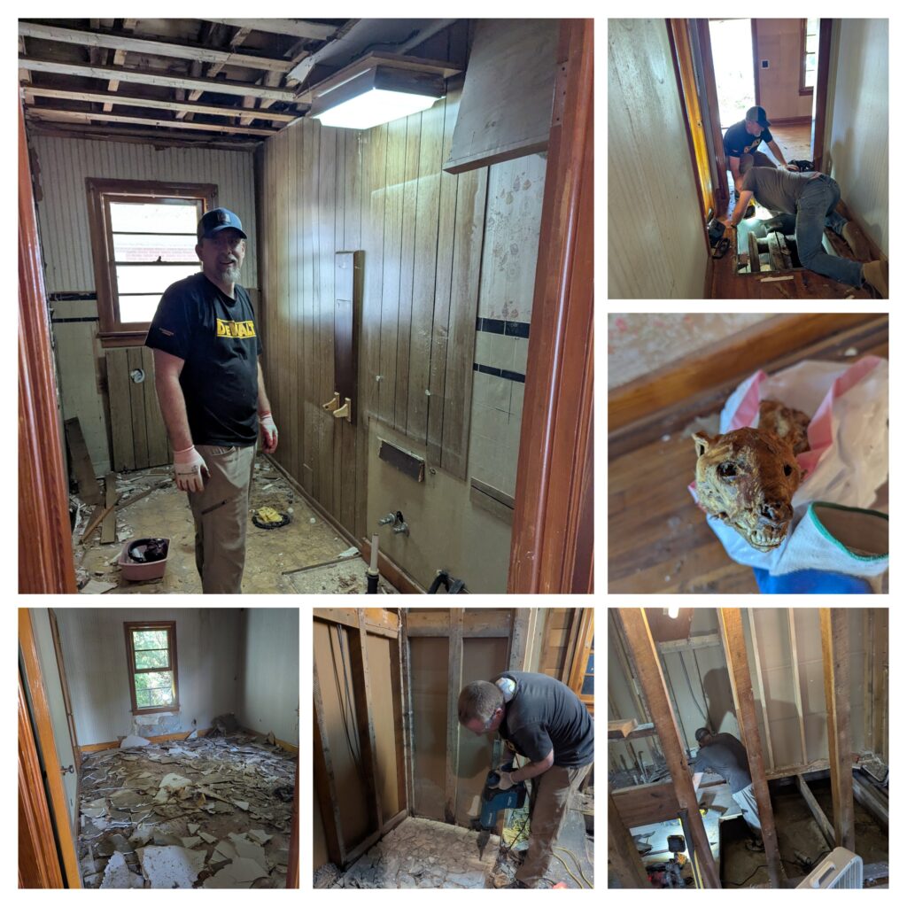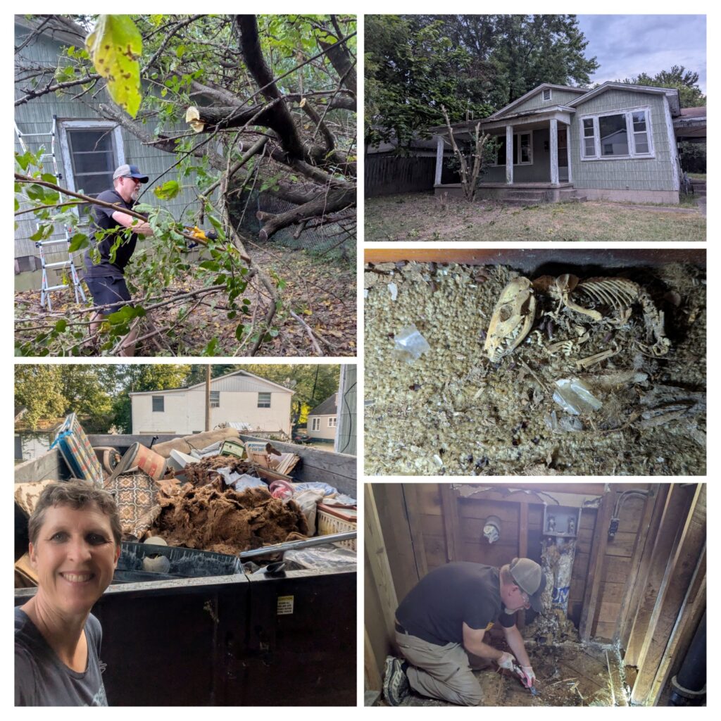 We were glad to get back to Kentucky the end of August and be settled in one place for a while. Since we left the end of March, we stayed in 27 different places and spent 71 nights in our little travel trailer. So getting back and settling into a normal routine was welcome. We came back to a project…we bought another house that we plan to flip. It is a house with good “bones”…but it needed cleaning out and updating after being empty for the last 10 years. It had other bones that needed to be removed as well…raccoon and possum skeletons from the attic . There were at least three layers of wallpaper on every wall and the ceilings were wallpapered as well. The demo is almost complete – the bathroom, kitchen and ceilings have all been taken out.